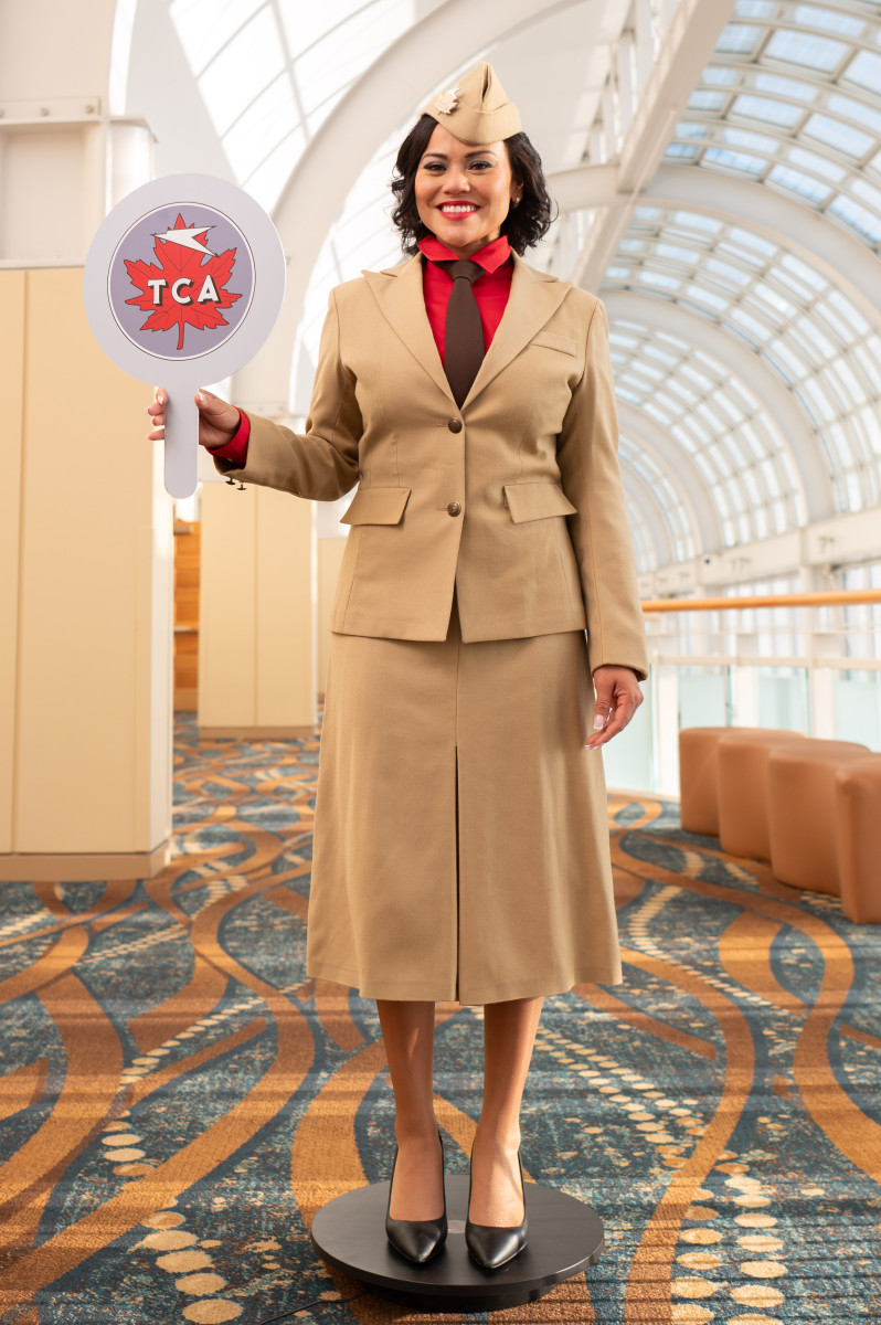 How does it feel wearing the very first flight attendant uniform? “It’s such an honour because it carries so much history. If I had to pick favourites, this one and the blue uniform stand out to me. They’re feminine, elegant, and beautifully detailed. It was a joy to wear!” Although very fashionable, this version of the uniform is the shortest lived in Air Canada/TCA’s history and only lasted from July to October 1938. It was replaced with a similar design; a summer grey version and a winter blue version starting that October until 1949.